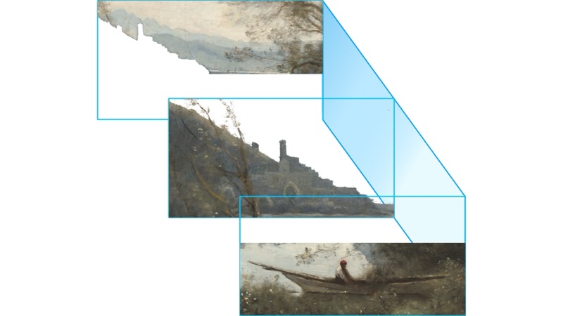 Let’s take a look at this painting by Corot, the moored boatman, souvenir of an Italian lake from 1861. We can see three layers in the painting, the boatman in the foreground, the castle on the hill in the middle ground, and the mountains in the distance. As we go back further into the painting, the colors change. They become bluer, softer, less clear, and less saturated, everything that we discussed previously.