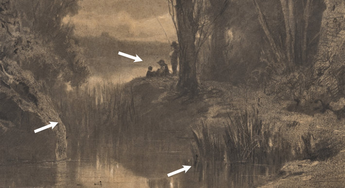 Edges can in fact provide us with a lot of diversity in how they work and what they can do for us. If we look for example at this charcoal drawing called “Three Fishermen Along the Banks of a River at the Edge of a Forest” by Adolphe Appian, we can see that for the most part the things in the foreground, like the plants here on the river, the edges are clearer than the same kind of plants as we move back slightly further in the distance.